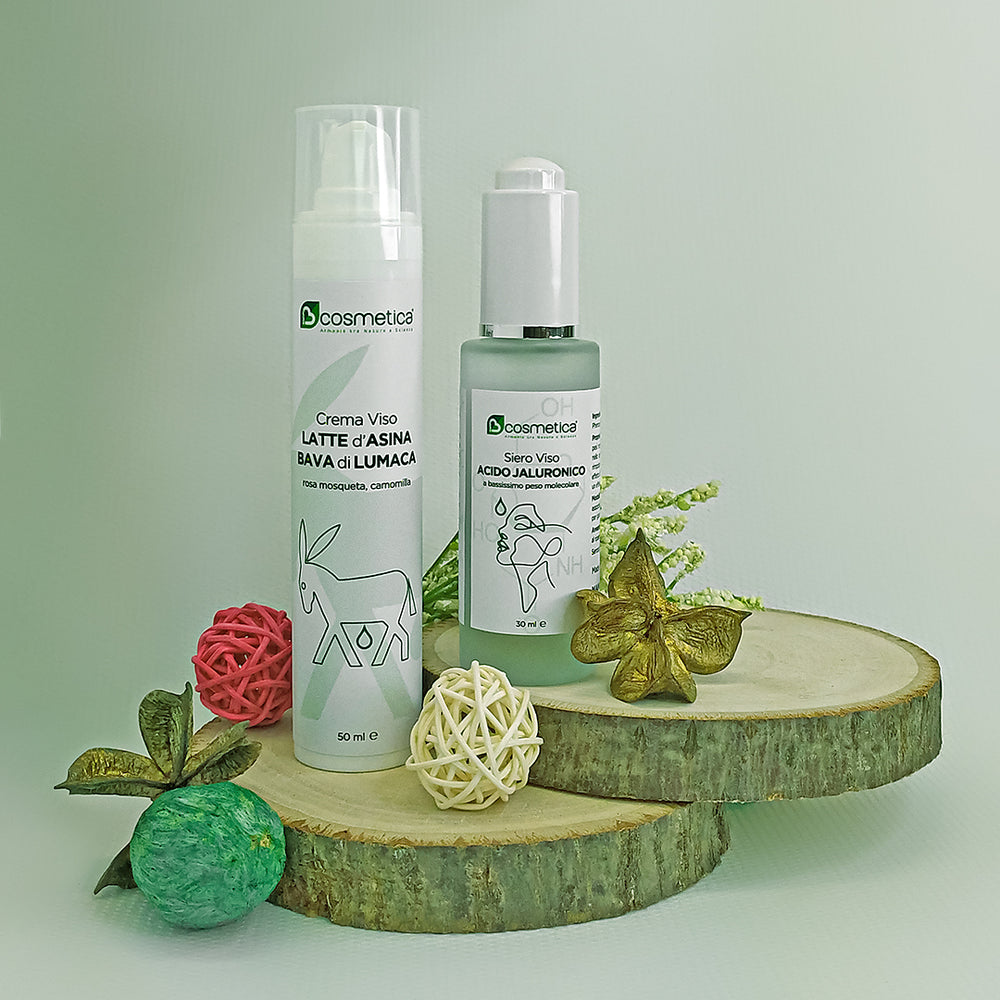Il Trattamento Viso Naturale di Bcosmetica è composto da 2 prodotti esclusivi e potenti della nostra linea, il Siero Viso Acido Ialuronico Puro a basso peso molecolare con contagocce e la Crema Viso Naturale Anti-Age con gli esclusivi estratti naturali Bava di Lumaca e Latte d’Asina.